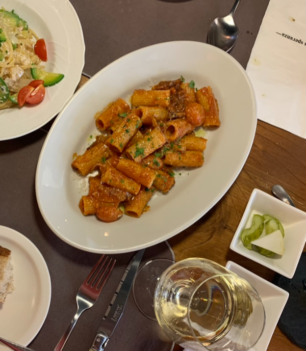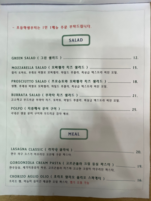 ๋ฉ๋ด๋ ์ ํต ์ดํ๋ฆฌ์ ์ค์ฌ. ์ ฐํ ํ ๋ช ์ด ์ง์ ์ด์ํ๋ ๋งค์ฅ๋ต๊ฒ, ํ์คํ, ์คํ ์ดํฌ, ๋จ๋ผ, ๋ผ์๋ ๋ฑ ์ ๊ฐํ ๊ตฌ์ฑ์ด์ผ.