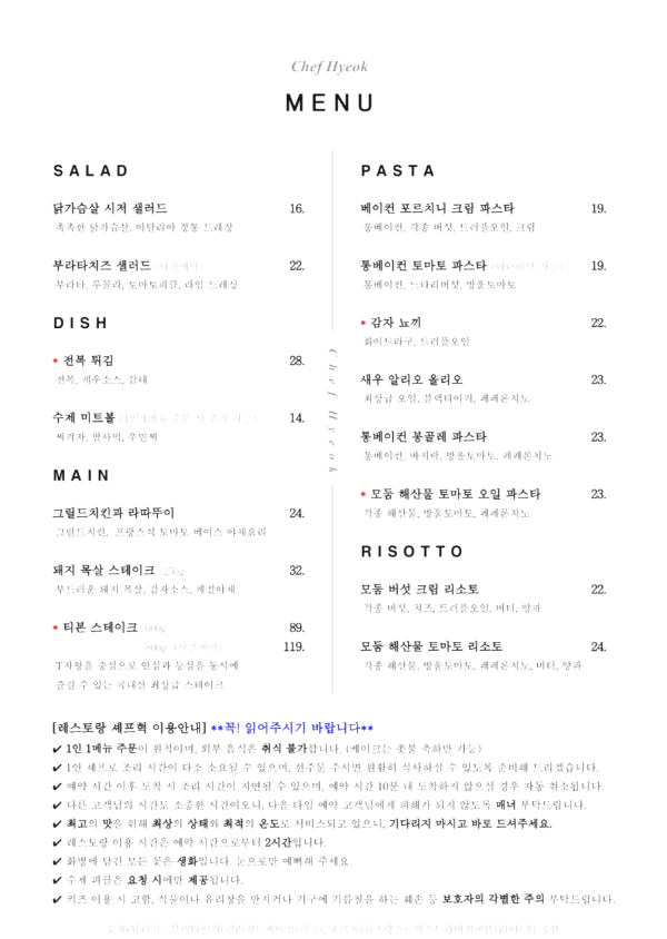 ์ ฐํํ์ ํ๋ ์น์ ์ดํ๋ฆฌ์์ ๊ธฐ๋ฐ์ผ๋ก ํ ๋ฉ๋ด๊ฐ ์ค๋น๋ผ ์์ด. ๊ณ์ ๋ง๋ค ๊ตฌ์ฑ์ด ์กฐ๊ธ์ฉ ๋ฐ๋๋ค๊ณ ํ๋๋ผ. ๋ฉ๋ดํ์ ๋ณด๋ฉด ์๋ฌ๋, ํ์คํ, ๋ฆฌ์ํ , ์คํ ์ดํฌ๊น์ง ๋ค์ํ๊ฒ ์๊ณ , ์์ธ ๋ฆฌ์คํธ๋ ๊ฝค ์ ๊ฐ์ถฐ์ ธ ์์ด.