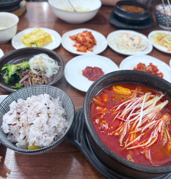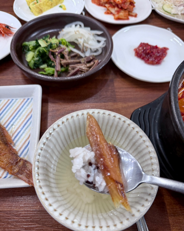 ๊ธฐ๋ณธ์ฐฌ์ ๊ณ๋๋ง์ด, ์ฐ๊ทผ์กฐ๋ฆผ, ๋ฐฐ์ถ๊น์น, ๊ณ ์ฌ๋ฆฌ, ๋ฌด๋๋ฌผ, ์๋ฌ๋, ์ง๋ฏธ์ฑ๋ณถ์, ์ค์ง์ด์ ๊ฐ ๋ฑ ๊น๋ํ๊ฒ ๋์๋๋ฐ, ๊ฐ์ด ์ธ์ง ์์ ๋์ฅ๋ฐฅ์ด๋ ์ ์ด์ธ๋ ธ์ด.