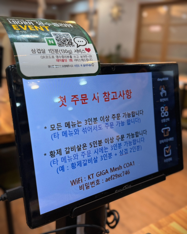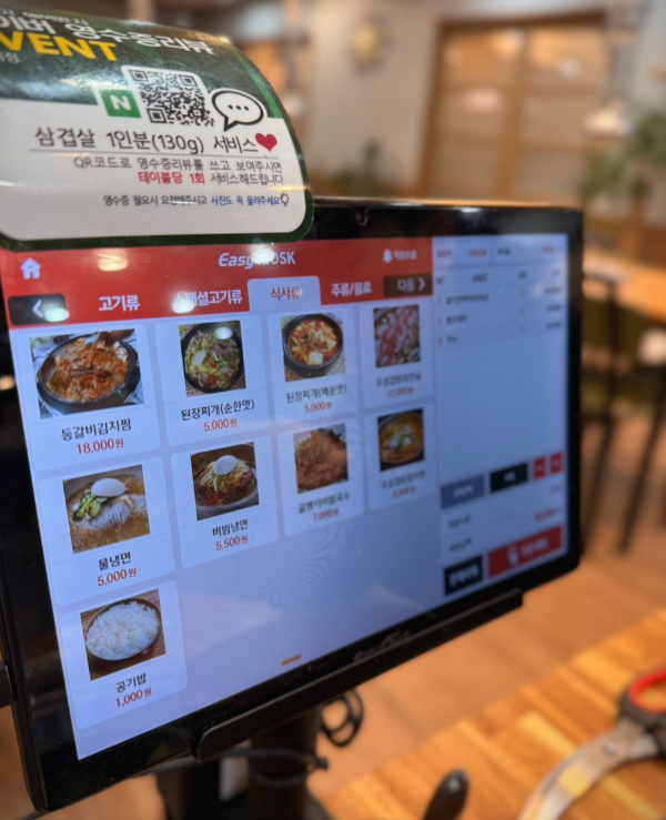 ํ ์ด๋ธ๋ง๋ค ํ๋ธ๋ฆฟ์ด ์์ด์ ๋ฉ๋ด ๋ณด๋ ๊ฒ๋ ์ฝ๊ณ , ๋ฐ๋ก ์ฃผ๋ฌธํ ์ ์์ด์ ํธํ์ด. ๊ณ ๊ธฐ๋ถํฐ ์์ฌ๋ฅ๊น์ง ์ข ๋ฅ๊ฐ ๊ฝค ๋ค์ํ์ด.