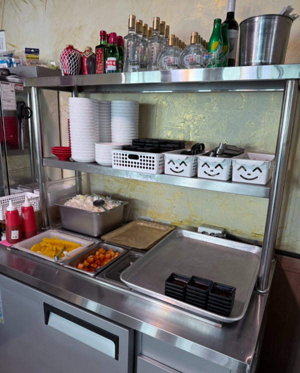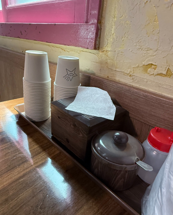 ํ ์ด๋ธ๋ง๋ค ์ข ์ด์ปต, ๊ณ ์ถง๊ฐ๋ฃจ, ์์ด ๊ฐ์ ๊ธฐ๋ณธ ์๋ ๋ค ์ ์ ๋ฆฌ๋ผ ์์๊ณ